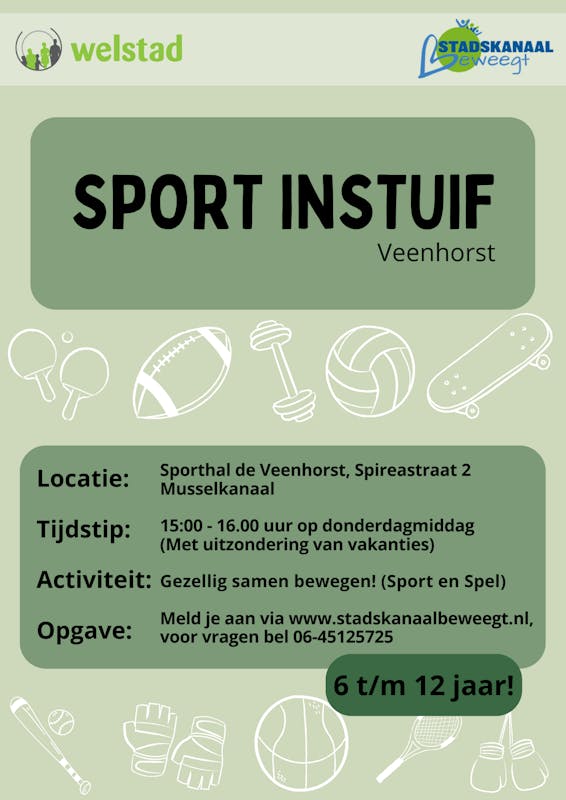Iedere donderdagmiddag in Musselkanaal, sportinstuif in de Veenhorst! Elke donderdag is er een sportinstuif in Musselkanaal voor de leeftijdsgroep 6 - 12 jaar. Tijdens deze sportinstuif worden verschillende sport- en spelactiviteiten georganiseerd door de Buurtwerker Sport Mussel/Musselkanaal