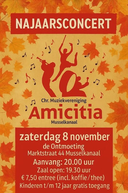 De Chr. Muziekvereniging Amicitia Musselkanaal nodigt iedereen van harte uit voor het najaarsconcert! Kom en geniet van een avond vol prachtige muziek, verzorgd door ons orkest en de malletband.