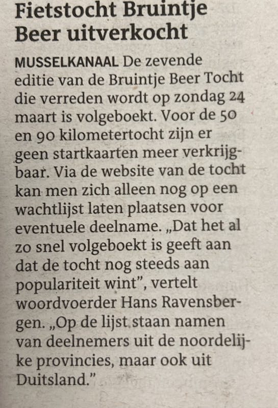 Fietstocht Bruintje Beer uitverkocht