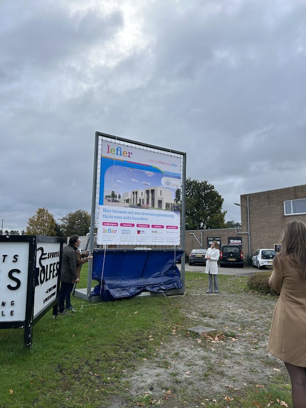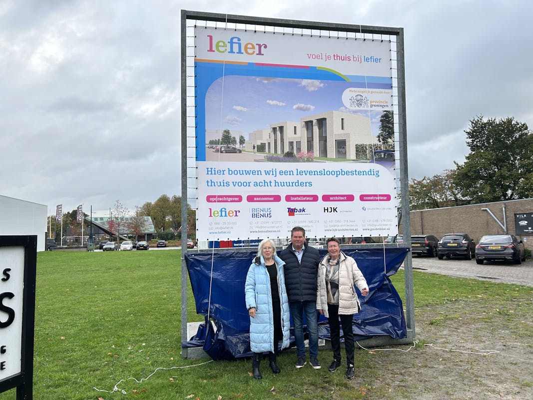 Onder toeziende ogen van verschillende instanties werd het bouwbord voor 8 woningen op het Eildert Lubbersplein onthuld door onder andere onze wijkwethouder Egbert Hofstra, hoewel in feite al met de bouw was begonnen