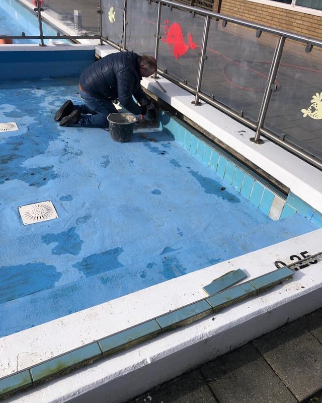 Wel is de afgelopen week voor het schone deel van het bad gestart met het schoonmaken van de witte rand om het zwembad. Ook is begonnen met het herstellen van de vorstschade aan de wanden en tegels. Deze worden weer vakkundig door Frits Schlimbach vervangen.