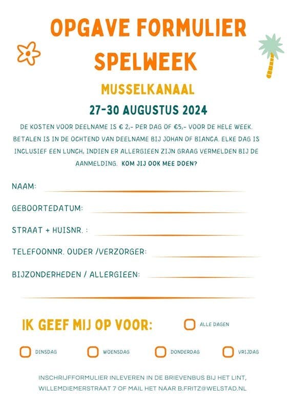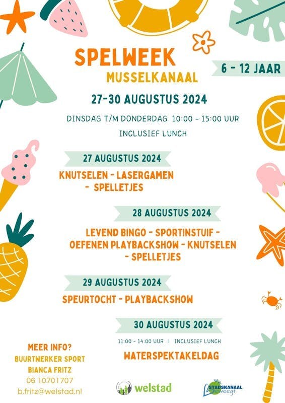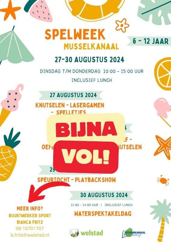 Wij kijken er naar uit om er een leuke spelweek van te maken! Ben of ken jij iemand met de leeftijd 6- 12 jaar die in Musselkanaal woont, kom jij dan mee doen? Geef je snel op, vol = vol!